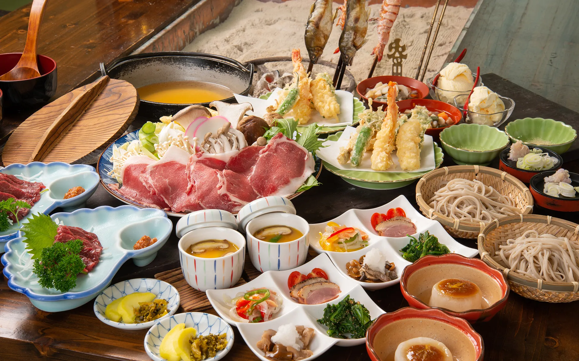 囲炉裏を囲みながら味わう会津の郷土料理。名物の馬刺しやこづゆ、手打ち蕎麦など、地元の旬の味覚が並びます。素朴ながらも心に残る、お食事の時間をお楽しみください。